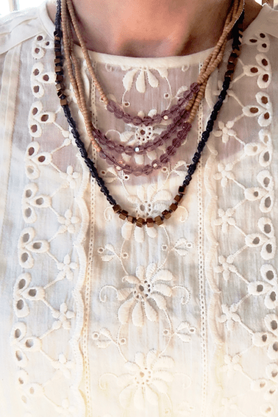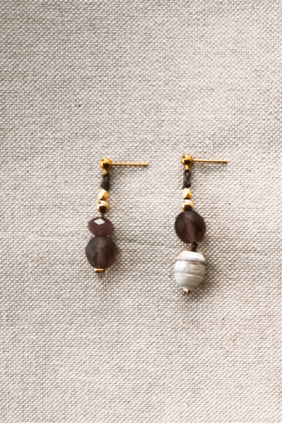 The GARDEN Earrings can be used in several contexts. The colour combination is purple with bronze-beige, green, and off-white notes. This colour combination works very well with outfits in these colours: dark grey, eggplant, purple, white, chocolate brown, navy blue, beige, orange, oxford, and mustard.