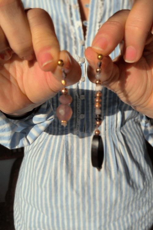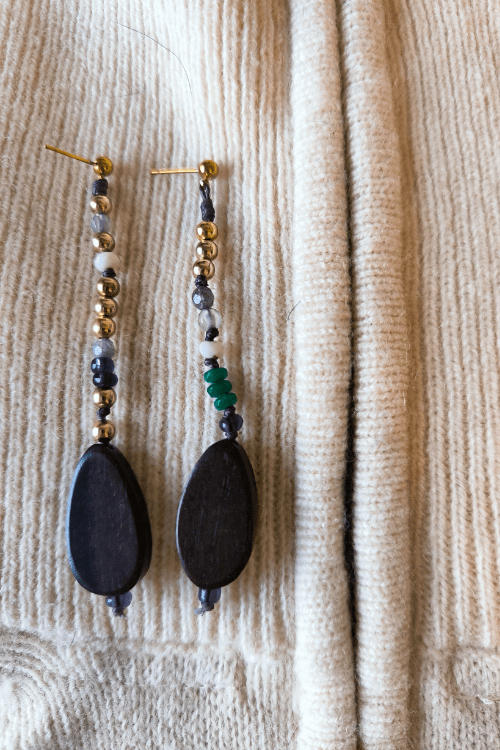 The GARDEN Earrings are a simple asymmetric design. It’s a confident, Mediterranean-inspired, modern pair of earrings with green agates, dark grey agate gemstones, hanging in a cascade, with a wood drop at the end.
