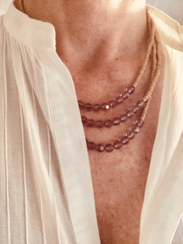 The Jewelry Arch Bundle features the HORIZON Necklace, a line of squares with purple seed beads, combined with the OPERA Necklace. It’s a calm and deliberate combination, and references the meeting point of architecture and the horizon. It’s a Mediterranean, modern, and confident piece.