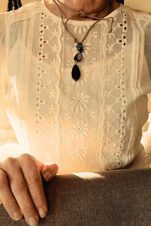 The TERRACE Necklace is a long fake leather necklace threaded with 3 pendant pieces. It’s a quieter piece defined by inner balance. Designed with subtle spacing and gentle transitions. It reflects the calm of an enclosed urban courtyard, Intimate, grounded, and timeless. It’s a Mediterranean, modern, and confident piece.