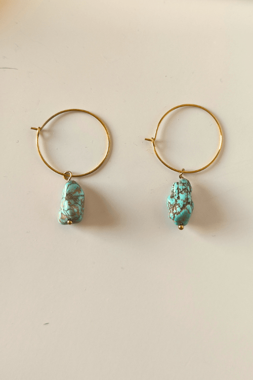 These pieces are handmade, lightweight, and made with rough turquoise gemstones and gold-plated brass.